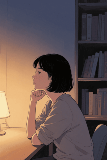 スケッチ、woman, black bob hair, thinking, elbow on desk, resting chin on hand, casual clothes, soft indoor lighting, warm tones, quiet room, contemplative expression, bookshelf, night, calm atmosphere