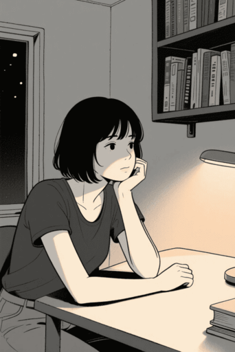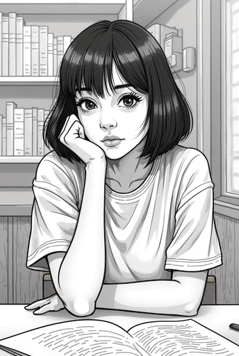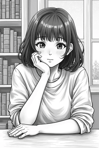 lineart,woman, black bob hair, thinking, elbow on desk, resting chin on hand, casual clothes, soft indoor lighting, warm tones, quiet room, contemplative expression, bookshelf, night, calm atmosphere