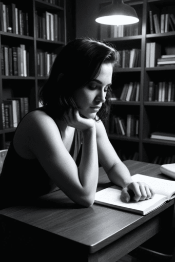 woman, black bob hair, thinking, elbow on desk, resting chin on hand, casual clothes, soft indoor lighting, warm tones, quiet room, contemplative expression, bookshelf, night, calm atmosphere