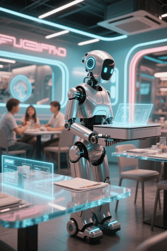 近未来的なファミリーレストラン、透明なテーブルに浮かぶホログラムメニュー。スリムでメタリックな配膳ロボットが正確な動きで料理を運んでいる。天井からは柔らかなネオンライト。