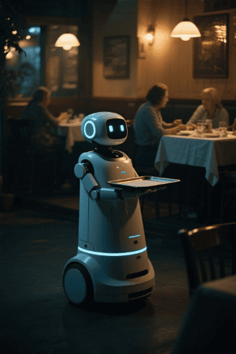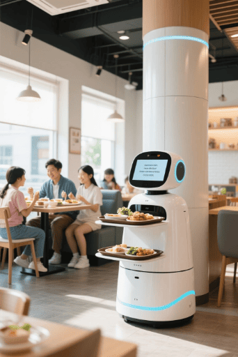 「現在実際に稼働しているような、R2D2っぽい、非人型の配膳ロボット」――とってもリアルで、現代的なイメージだね🍽️🤖
