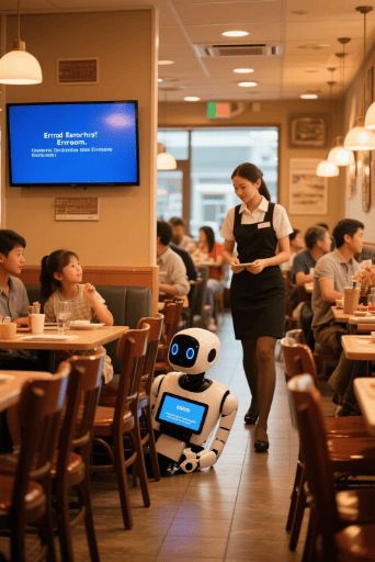 service robot stuck, busy family restaurant, realistic interior, LCD screen with error message, waitress approaching, chairs blocking path, semi-comical moment, real-world robotic assistance, warm lighting