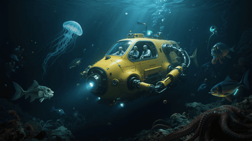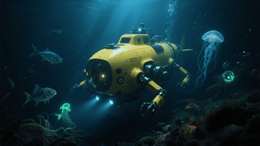 realistic unmanned deep sea exploration submarine, yellow hull, underwater, exploring deep ocean, surrounded by glowing jellyfish and bizarre deep sea creatures, scientific design, mechanical arms, navigation lights, sonar equipment, dark blue deep sea background, cinematic lighting, floating particles, ultra-detailed, realistic style, underwater science documentary