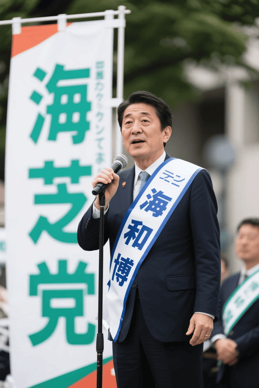 議員選挙候補者の演説、看板には”海芝党”と書かれている。演説者のたすきには、”海和 博”と書かれている。