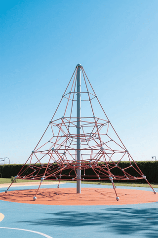 rope climbing net (1.2), geometric rope structure, pyramid shape (1.1), modern playground (1.2), red and black ropes, no people (1.3), sunny day, clear blue sky, soft shadows, safety flooring, peaceful atmosphere, architectural aesthetic