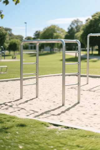 empty monkey bars (1.2), silver metal structure (1.2), clean sandy playground (1.1), sunny daytime park (1.2), no people (1.3), peaceful atmosphere, bright sky, soft shadows, maintained equipment, green grass, light breeze, quiet midday scene