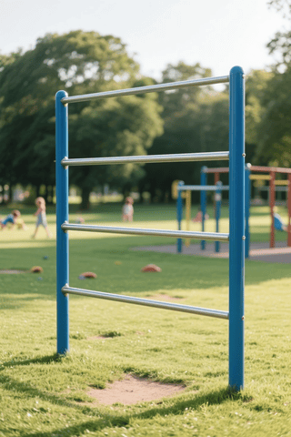 horizontal bars, three heights (1.2), silver metal bars, blue supports, clean and well-maintained (1.2), daytime park (1.2), empty playground, traces of children’s play, nostalgic atmosphere, peaceful mood, soft lighting, green grass, clear shadows