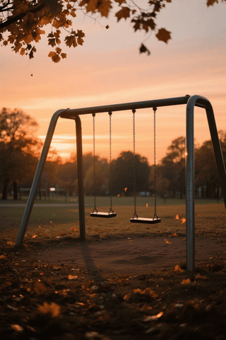 lonely swing, metal swing, empty playground, sunset sky (1.2), warm orange lighting (1.1), long shadows (1.1), autumn leaves fluttering, nostalgic atmosphere (1.2), evening park, melancholic mood, soft breeze, no people