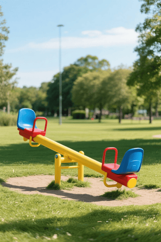 colorful seesaw (1.2), empty park (1.1), daytime (1.2), red and blue seats, yellow support beam, clean and well-maintained (1.2), horizontal position, no people, short green grass, bright sky, peaceful mood, sunlight reflections, quiet atmosphere