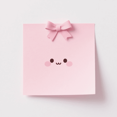cute sticky note, pastel pink, square with rounded corners, small ribbon on top center, soft smooth paper texture, kawaii style, plain white background, centered front view, 1:1 aspect ratio, soft lighting, high quality illustration