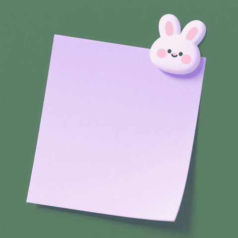 cute sticky note, pastel lavender, square shape with rounded corners, small cartoon bunny icon in top right corner, soft smooth paper texture, kawaii style, plain white background, front view, 1:1 aspect ratio, high quality illustration