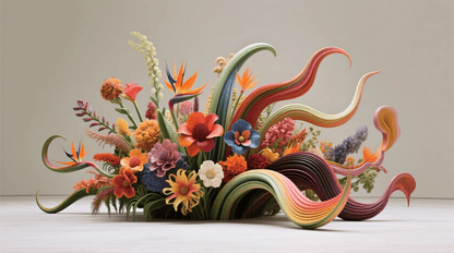 monumental avant-garde floral installation, bold and unconventional design, multi-species and multicolored exotic flowers, dynamic sweeping shapes, flowing lines, grand spatial presence, high detail, artistic textures, centerpiece masterpiece, isolated on neutral background