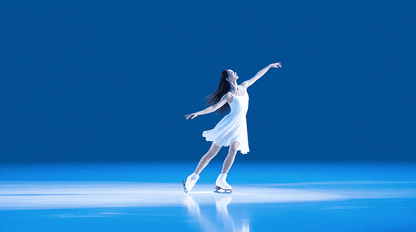 female figure skater, performing on ice stage, graceful pose, elegant movement, white simple dress, flowing long hair, serene expression, spotlight on ice, magical lighting, minimal background, cinematic atmosphere, icy reflections, delicate posture, professional athlete