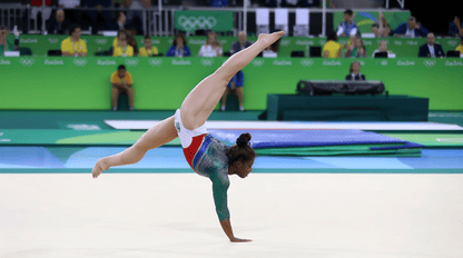 1人のオリンピック体操選手が床運動でアクロバティックな演技をしている