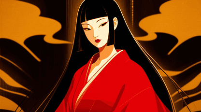 illustration, beautiful Japanese woman, long straight black hair, crimson modern kimono dress, flat color, bold outlines, Tsuruta Ichiro style, gold and black abstract Japanese background, cool and dignified, 2D art