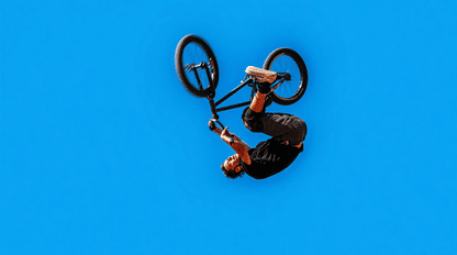 BMX rider performing a backflip, fully upside down, bike and rider in inverted position, mid-air, cinematic low angle shot, blue sky background, motion blur, dynamic pose, realistic BMX bike, detailed frame, extreme sports photography style
