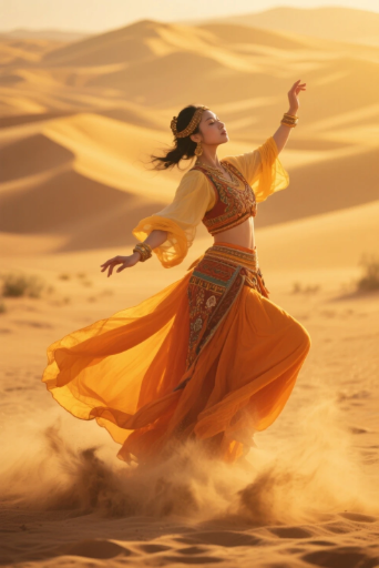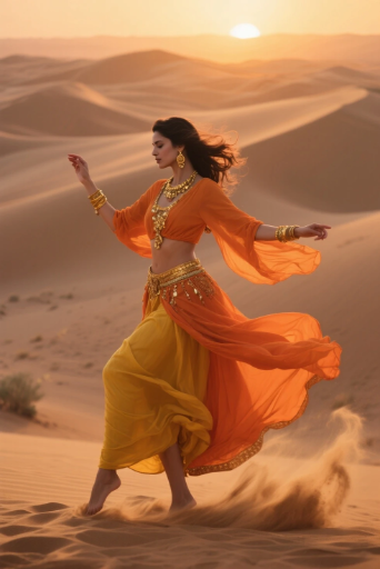 a full shot of an elegant woman, mid-motion, dancing gracefully in the desert, wearing traditional desert attire, flowing orange and yellow fabrics, golden jewelry, warm sunset lighting, sand swirling around her feet, dunes in the background, cinematic, highly detailed, realistic, photography