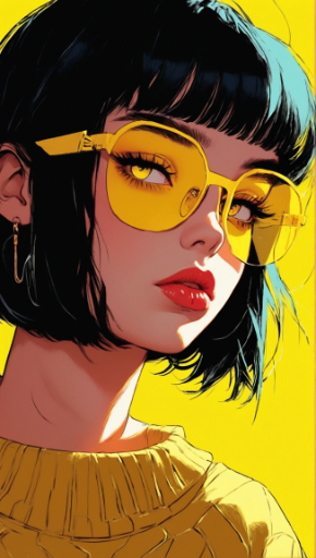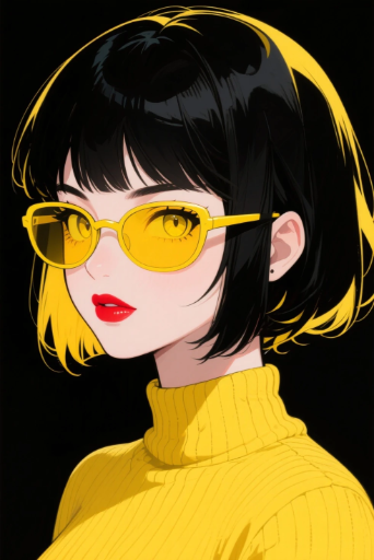 a portrait of a young woman with a bob haircut, black hair, looking to the side, wearing yellow sunglasses, yellow sweater, red lipstick, intense yellow eyes, in the style of anime and comic books, vibrant yellow and black colors, high contrast, clean lines, detailed, digital painting