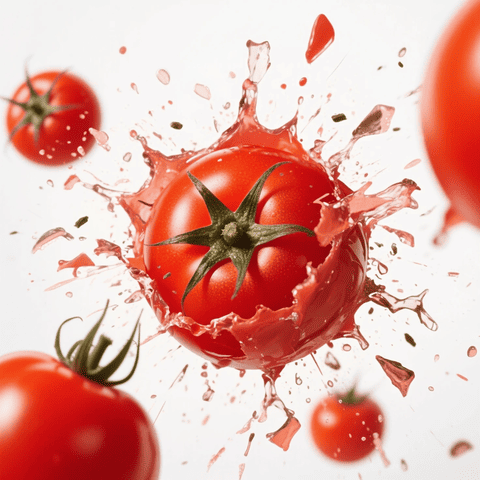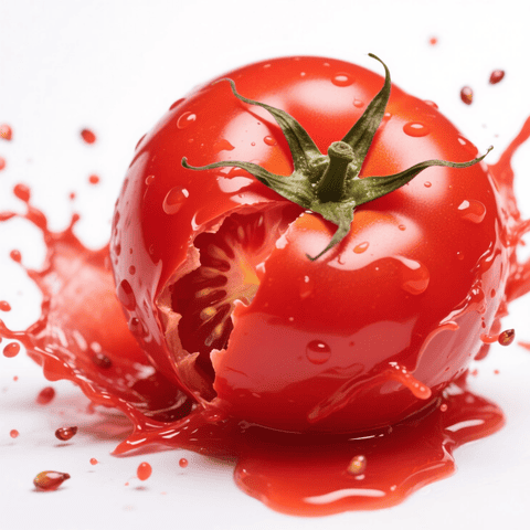 A realistic close-up photo of a tomato exploding in a splash of juice against a clean white background.