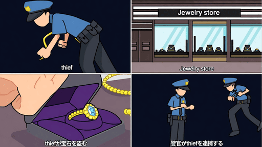 シーン1とシーン4では警官が泥棒になってしまいました。驚いたのはテキスト部分です。他のユーザーの方のセリフや解説部分はどこの言語にもなっていませんでした。しかし、この画像では、英語、漢字、かな交じりではありますが正しく表記されています。「英語+かな+漢字」を正しく生成できたのは、初めてのことです。