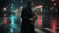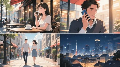 4つのシーンに分かれている:シーン1「若い女性がカフェテラスでコーヒーを飲んでいる」、シーン2「男性がスマホで話している」、シーン3「男性と女性は街中を歩いている」、シーン4「都会の夜景」