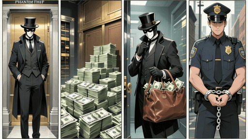 The scene is divided into four parts: Scene 1: “The gentleman thief in the top hat stands in front of the bank.” Scene 2: “The bank vault is filled with stacks of banknotes.” Scene 3: “The gentleman thief stuffs the banknotes from the vault into a duffel bag.” Scene 4: “The gentleman thief is arrested by the police and handcuffed.”