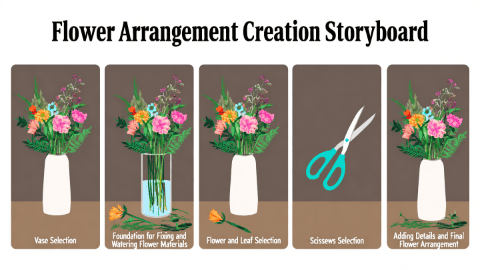 花のアレンジメント作成のストーリーボード、5つのパネル:花器の選択、花材を固定し水を与えるための土台、花と葉物の選択、ハサミの選択、詳細の追加と最終的なフラワーアレンジメント