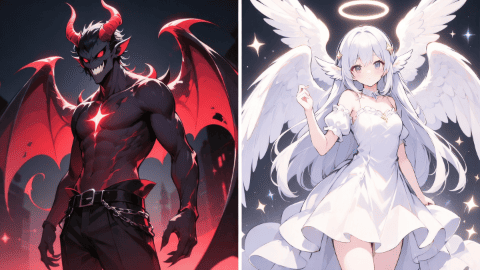アニメ、二つのシーン:1つ目のシーンには悪魔がいる。2つ目のシーンには天使がいる。
