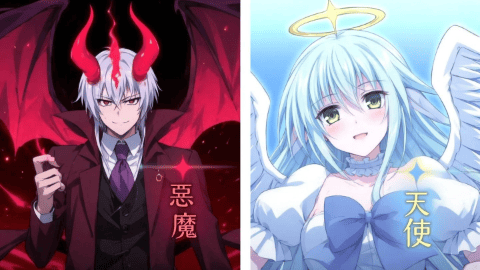 Anime, two scenes: The first scene features a demon, written in Japanese as “悪魔”. The second scene features an angel, written in Japanese as “天使”.