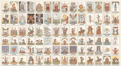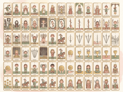 完全78枚タロットデッキプロンプト:統一されたミニマリストかわいいスタイルの13×6グリッドタロットカードイラスト。ダスティローズ、セージグリーン、クリームアイボリー、ソフトゴールド、ジェントルラベンダーの柔らかく落ち着いたカラーパレットと暖かいオフホワイト背景。シンプルな幾何学的形状、クリーンなライン、繊細なラインワークと微妙なゴールドフォイルアクセント。キャラクターは全体を通して同一:丸く柔らかい顔、点の目、小さく優しい特徴、簡略化された体のプロポーション(ちびインスパイアだがエレガント)。スタイル参照:モダンインディータロットがスカンジナビアイラストレーションとカワイイミニマリズムに出会う。各カードは薄いゴールデンボーダーと微妙な丸みを帯びたコーナーでフレーミング。すべてのカードに一貫した要素:左上からの柔らかい拡散照明、優しいドロップシャドウ、紙のテクスチャオーバーレイ、マット仕上げの外観、ホワイトスペースのあるパステル水彩ウォッシュ背景、最小限のディテールでフラットに簡略化された形式でレンダリングされたシンボリックオブジェクト。第1行(大アルカナ0-12):愚者から吊るされた男まで。第2行(大アルカナ13-21+ワンドエース-3):死から棒の3まで。第3行(ワンド4-キング+カップエース-2)。第4行(カップ3-キング+ソードエース)。第5行(ソード2-キング+ペンタクルエース-2)。第6行(ペンタクル2-クイーン)。技術メモ:各カードはグリッドセル内で等しい比率でレンダリング、カードあたり2:3アスペクト比、一貫した8pxゴールデンボーダー、柔らかいアンビエントオクルージョンシャドウ、フルグリッド全体のパレットハーモニーを確保する色補正。ガッシュと色鉛筆のハイブリッドを模倣したデジタルイラストスタイル、暖かさを維持しながらビンテージ感のためにわずかに彩度を下げる。ムード:優しい、神秘的、親しみやすい、瞑想的、居心地の良い、魔法のような。