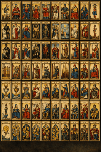 完全78枚タロットデッキプロンプト:統一されたクラシック・オーソドックススタイルの13×6グリッドタロットカードイラスト。伝統的なライダー・ウェイト版にインスパイアされた詳細で象徴的なビジュアル。リッチで深みのあるカラーパレット(ディープレッド、ロイヤルブルー、エメラルドグリーン、オーカーイエロー、アイボリー、ブラック、アンティークゴールド)と、わずかに経年変化したパーチメント調の背景。