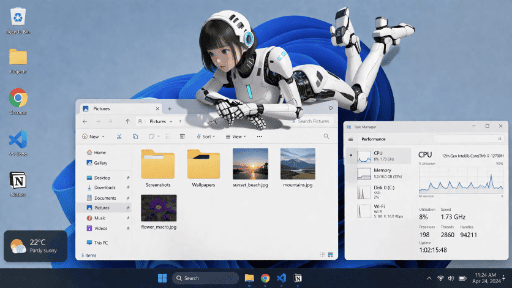 - Appears as a desktop mascot overlay interacting with real OS UI