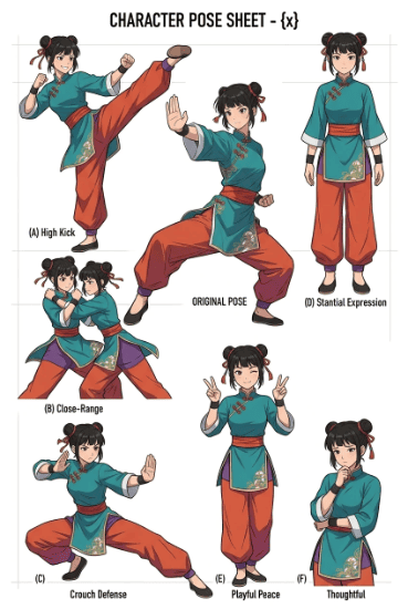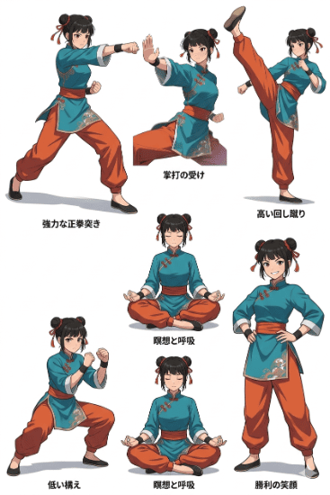 簡単なプロンプトでポーズシートを作成できました。このポーズシートを利用すれば、画像作成時のプロンプト作りに役立てることができると思います。また、任意のポーズを切り取って元画像としてアップロードすれば、Edit系やNano Banana系のモデルでオリジナル画像のポーズ変更が簡単にできますね。これは、かなり役に立つと思います。