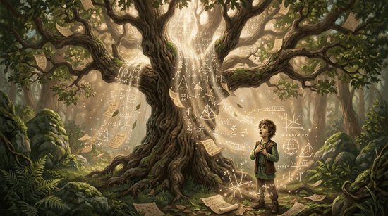 数学の大樹から数学があふれ出す瞬間を描いてください。樹齢1000年の大樹から数学があふれ出しています。大樹のそばには少年がいてあふれ出す数学を見つめています。リアルだけれどファンタジーそのような世界観で描いてください。