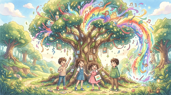 芸術の大樹から芸術があふれ出す瞬間を描いてください。樹齢1000年の大樹から芸術があふれ出しています。大樹のそばには子どもがいてあふれ出す芸術を見つめています。アニメ調で柔らかな色彩で描いてください。