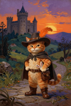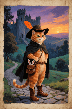 An enchanting, antique European storybook illustration, executed in the same traditional, textured oil painting style on aged paper as seen in image_0.png, depicting the title character from “Puss in Boots”. A charming, anthropomorphic orange tabby cat is the central figure, standing upright on two legs. It wears miniature, finely crafted brown leather boots, a wide-brimmed hat with a vibrant orange feather plumed to the side, and a simple dark cloak draped over its shoulders. The cat has a sly, confident smirk on its face, looking towards the viewer. It stands on a cobblestone path leading up to a grand, weathered medieval castle in the background. Around its waist is a belt with a small satchel, from which a pair of rabbit ears are comically peeking out. The setting is a bustling but pastoral French countryside at twilight, with textured trees and rolling hills, similar to the dark, textured woodland in image_0.png but with more open light. A warm, golden sunset glows on the horizon, creating rich, saturated orange and purple hues in the sky, contrasted with deep, cool green and blue shadows in the landscape. The art style features heavy, visible brushstrokes and a deep color palette. A medium shot, focusing on the cat’s full pose and its detailed attire. The background is softly blurred to emphasize the character.