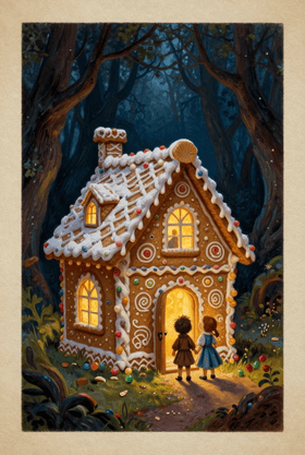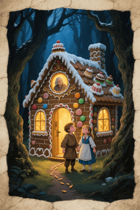 An enchanting, antique European storybook illustration, executed in the same traditional, textured oil painting style on aged, fibrous paper as seen in image_0.png, depicting the pivotal moment from ‘Hansel and Gretel’. The central focus is the irresistible, highly detailed gingerbread house, made of spiced gingerbread bricks, adorned with colorful hard candies, intricate royal icing patterns, windows made of spun sugar panes (glowing warm golden from within), and a roof tiled with miniature cakes and dusted with powdered sugar. Two small children, Hansel and Gretel, stylized and cute with innocent, curious expressions and traditional German rustic clothing (Hansel in a textured brown tunic, Gretel in a blue dress with a white apron, both styled after image_0.png), stand cautiously and hand-in-hand at the threshold, looking up. The setting is nestled deep within an ancient, imposing forest of dark, twisted, textured trees, similar to the deep woodland atmosphere of image_0.png. The scene is nocturnal, dominated by cool, deep blue and green shadows, creating a dramatic contrast with the intense, welcoming warm golden light spilling from the windows and open door of the sweet house. A small trail of breadcrumbs leads away from them on the dark forest floor path in the foreground. Inside one glowing window, the indistinct, hunched, and blurry profile of an old woman is subtly visible. The art style features visible, heavy brushstrokes and a rich, deeply saturated color palette with a clear contrast between cold and warm hues. The composition is a medium shot, framing the entire cottage and the children. The background is softly blurred to emphasize the cottage, but the dark forest texture remains prominent. The overall image has a textured, aged paper border, identical to the framing of image_0.png.