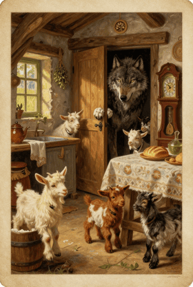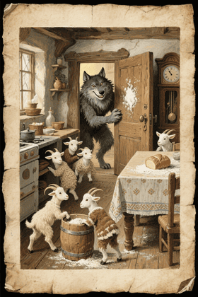 An enchanting, antique European storybook illustration, executed in the same traditional, textured oil painting style on aged, fibrous paper with a worn parchment border as seen in image_0.png, depicting the pivotal moment from ‘The Wolf and the Seven Young Goats’. The setting is inside a cozy, rustic German cottage kitchen, bustling with activity and warm, filtered light spilling in from a window on the left. Six young goats (kid goats), each individually characterized and cute with varied textured coats (cream, brown, piebald) similar in stylization to the children in image_0.png, are visible. Four are in the foreground, scrambling to hide: one climbs into a flour barrel, one squeezes into a bread bin, one ducks under a patterned tablecloth on a large wooden table, and another hides behind a grandfather clock (partially visible). In the background, at the threshold of the partially open, heavy oak front door (similar to the door in image_0.png), stands a large, imposing, dark gray wolf, its fur shaggy and textured. Its face is deceptively smiling, but its eyes are cunning, and one large, flour-covered white paw is distinctly visible as it rests on the door frame. Two more kid goats hide behind furniture near the door, peering out with worried expressions. The art style features heavy, visible brushstrokes and a rich, deeply saturated color palette with a clear contrast between the cozy warmth inside (golden hues, soft greens) and the dark shadow of the wolf’s silhouette. The cottage interior is detailed with textured stone, aged wood, pottery, and hanging dried herbs, maintaining the rustic complexity of image_0.png. The composition is a medium shot, framing the entire kitchen and the interaction. The overall image has a textured, aged paper border, identical to the framing of image_0.png.