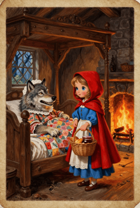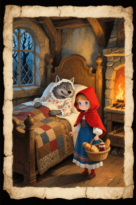 An enchanting, antique European storybook illustration, executed in the same traditional, textured oil painting style on aged, fibrous paper with a worn parchment border as seen in image_1.png, depicting the famous scene from ‘Little Red Riding Hood’. Inside a rustic, detailed grandmother’s bedroom, a stylized and cute Little Red Riding Hood stands by the bed. She has large, innocent blue eyes, wearing her signature vibrant red hooded cloak over a blue and white traditional peasant dress, carrying a wicker basket filled with bread and a jam jar. Lying in the grand, carved wooden four-poster bed is the Big Bad Wolf, deceptively dressed in a floral nightgown and a white ruffled lace nightcap. The wolf has a cunning, toothy grin and textured grey fur. The setting is rich with rustic details: a stone fireplace with a glowing orange fire on the right, and a lattice window on the left showing a glimpse of the dark, twisted forest outside. The lighting creates a dramatic contrast between the warm golden glow of the hearth and the cool, pale blue light from the window. The art style features visible, heavy brushstrokes and a deep, saturated color palette on aged paper. Medium shot, focusing on the interaction between Red Riding Hood and the wolf. High detailed textures on the wooden furniture, patchwork quilt, and fabrics. The overall image has a textured, aged paper border, identical to the framing of image_1.png.