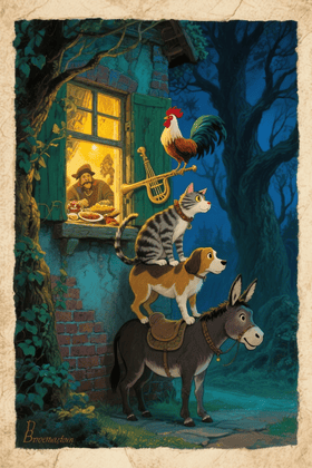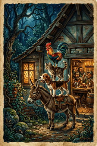 An enchanting, antique European storybook illustration depicting the Bremen Town Musicians stacked outside a cozy robber’s house at night. The four animals are stylized and cute, arranged in their classic tower: a donkey at the bottom, a hunting dog on its back, a tabby cat on the dog’s back, and a rooster perched on top. They are peering intensely through a glowing, rustic window pane. Inside the window, a warm, golden light spills out, revealing blurry, messy shapes of robbers and rich food. The exterior is a dark, old forest with textured, twisted trees and a brick wall with ivy. The art style is traditional, textured oil painting on aged paper, reminiscent of vintage fairy tale book plates. Rich, deeply saturated colors with heavy brushstrokes. A dramatic contrast between the cold blue and green night shadows and the warm yellow light from the window. Soft focus on the background. Medium shot, slightly low angle. High detailed textures, charming character designs.