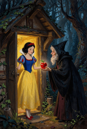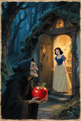An enchanting, antique European storybook illustration, executed in the same style as image_0.png, depicting the pivotal moment between Snow White and the old witch. At the cottage door, a stylized, beautiful Snow White with fair skin, dark hair, and a blue bodice dress stands, her face a mix of innocence and hesitation. Opposing her is a deceptively friendly but sinister, old crone, hunched over and wearing a dark hooded cloak, offering a perfect, vibrant, glistening red apple with a tiny green leaf. The crone’s face is lined with a fake, knowing smile. The setting is the threshold of the Seven Dwarfs’ small, cozy forest cottage, bathed in soft, diffused golden light from within, casting warmth on Snow White’s back. The exterior is a detailed, dark, twisted forest with textured trees and ivy, similar to image_0.png’s woodland atmosphere, with cold, deep blue and green shadows creeping in from the woods. The apple itself seems to glow faintly with a dangerous, intense red. The art style is traditional, textured oil painting on aged, fibrous paper, with heavy, rich brushstrokes. Deeply saturated colors creating a dramatic contrast between the cottage warmth and the forest shadows. A medium shot, focusing on the dynamic interaction and the apple, with detailed textures on the fabric and wood. Charming but atmospheric character designs.