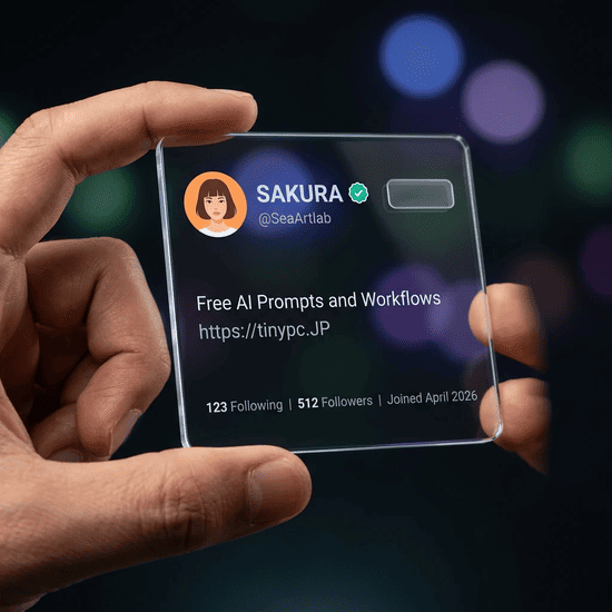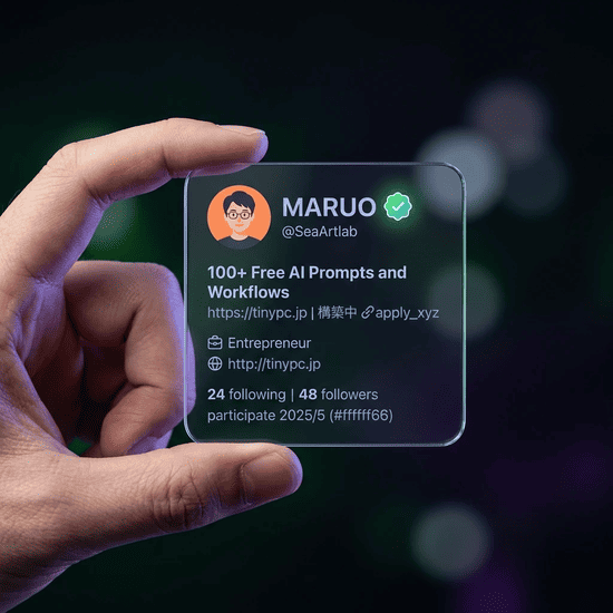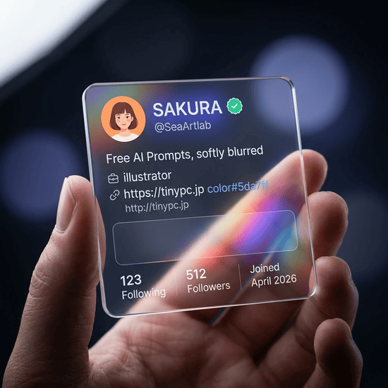 Gemini3+Nano Banana 2を使用すれば、初めに使ったプロンプトでも正しく画像生成されます。SeaArt版Nano Banana 2では、テキストの色指定を行うと、色指定そのものがテキストとして出力されてしまいます。また、テキストは日本語で入力しても英語に変換されてしまいます。従って、SeaArt版Nano Banana 2で透明ガラスプロフィールカードを作成すことは、Gemini3+Nano Banana 2で作成するよりはるかにハードルが高いです。