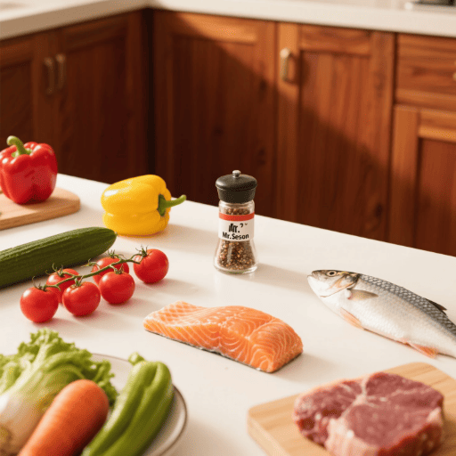 野菜と魚と肉、様々な調味料、料理をする前の下準備
