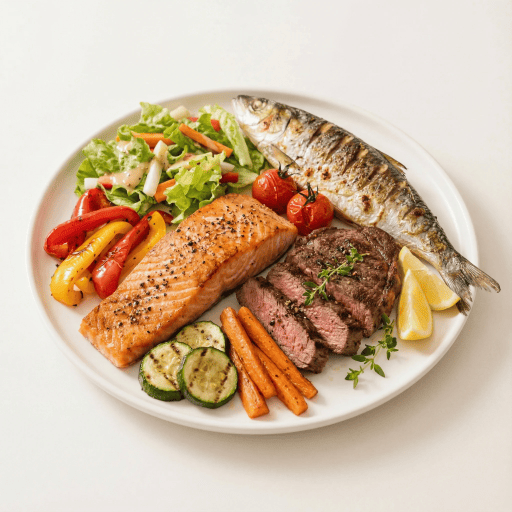 これらの食材で美味しいランチを作って、お皿に盛り付けてください。お皿のクローズアップビューで、他の皿や食材は取り除いてください。