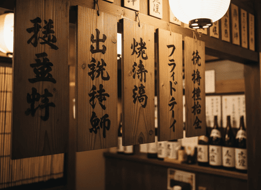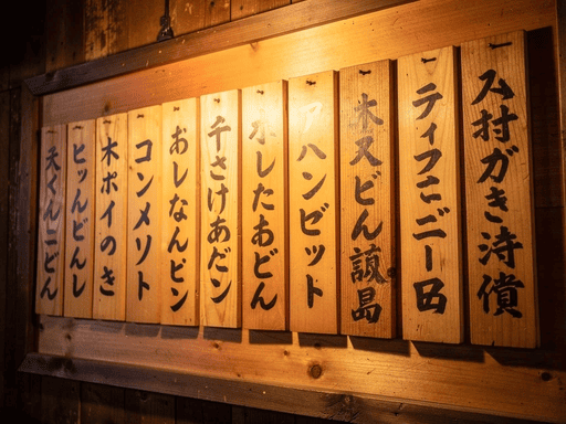 古い木の温もりを感じる居酒屋の壁に、縦長の木札が整然と並んでいる。