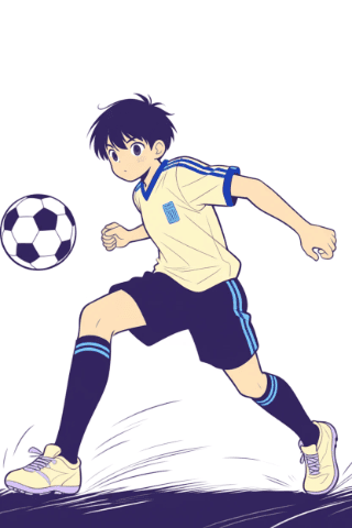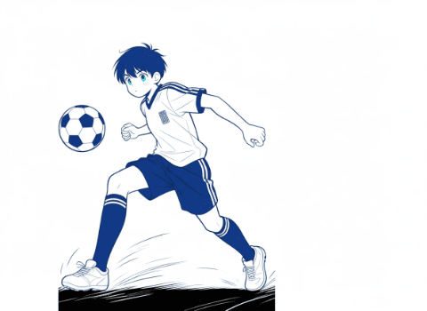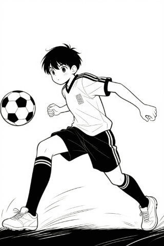soccer boy, middle school age, shooting a ball, dynamic pose, concentrated expression, manga style, simple line art, clean lines, black and white, minimal shading, action moment, motion lines
