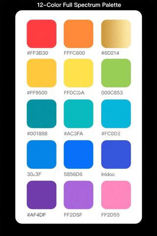 Below each square swatch, the corresponding HEX code is written in a clean, dark grey, sans-serif font. The title “12-Color Full Spectrum Palette” is centered at the very top. Flat design style, clean lines, high resolution graphic design resource.