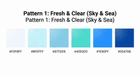 A minimalist color palette chart featuring 6 square color swatches arranged horizontally in a row. The theme is “Fresh & Clear (Sky & Sea)”. The colors transition from pale ice blue to deep cobalt blue.