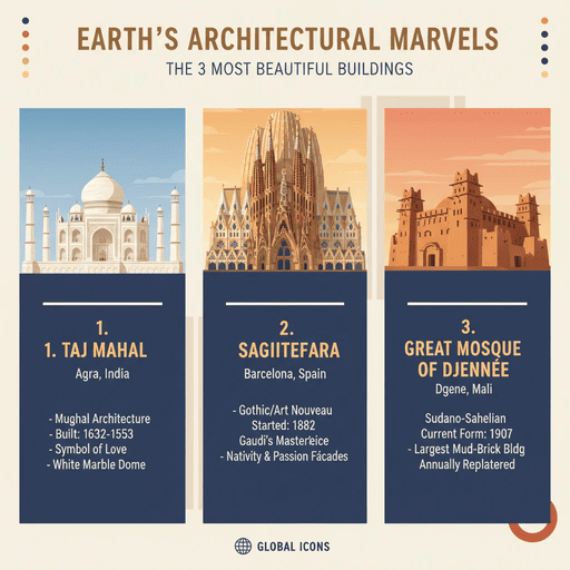 地球上でもっとも美しいと言われる建物3つのインフォグラフィックを作成してください。