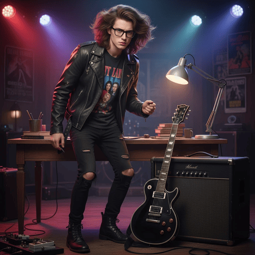 この男性をイケイケでツンツンヘアーのロックギタリストに変えてください。
